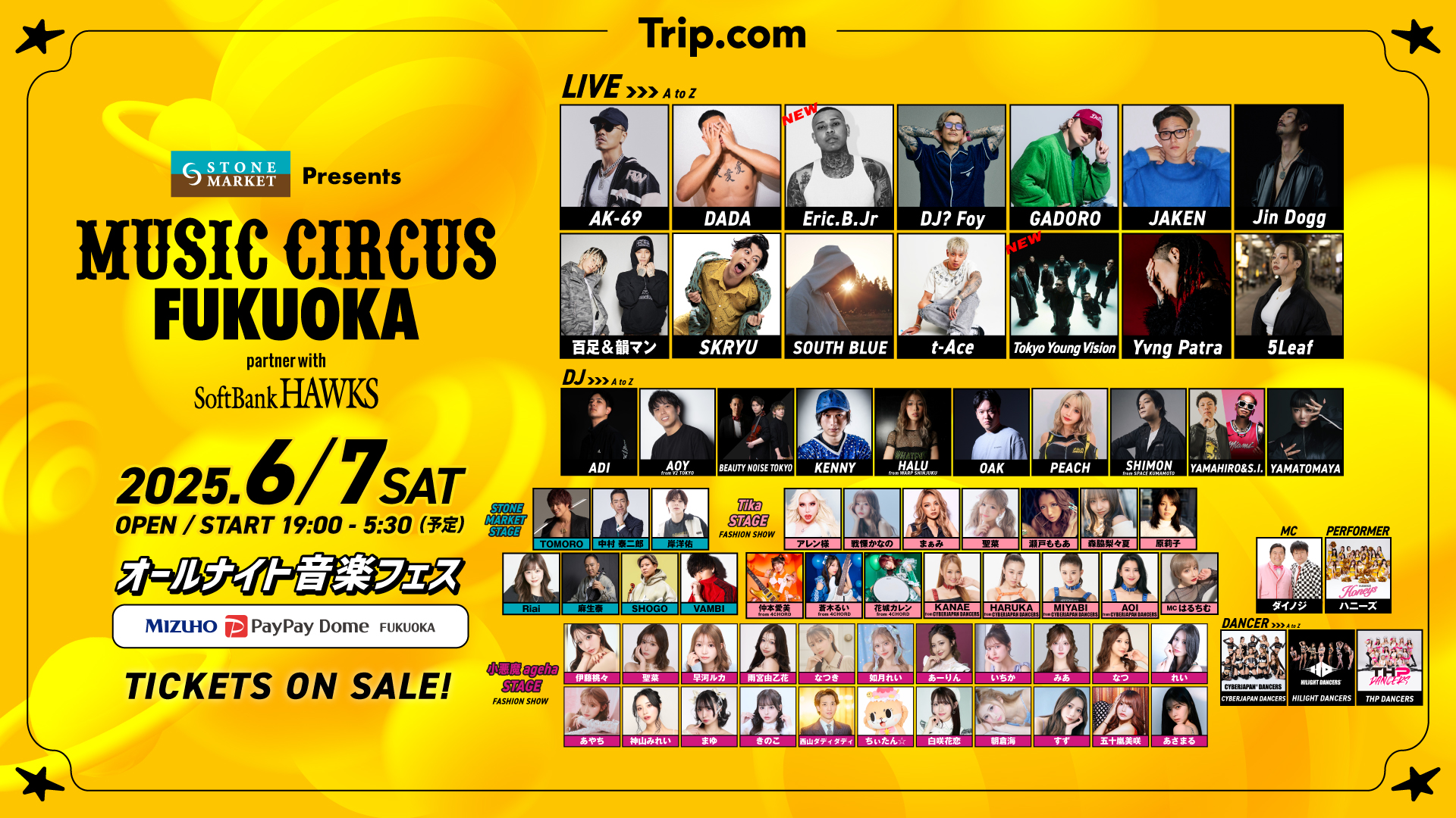 株式会社TryHard Japan(大阪市中央区)は、2025年6月7日(土)にみずほPayPayドーム福岡で開催されるオールナイト音楽フェス「STONE MARKET Presents MUSIC CIRCUS FUKUOKA partner with SoftBank HAWKS」のフルラインナップを発表いたします。